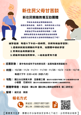 【轉知】國北教心理與諮商學系-新住民父母甘苦談-新住民親職教養互助團體