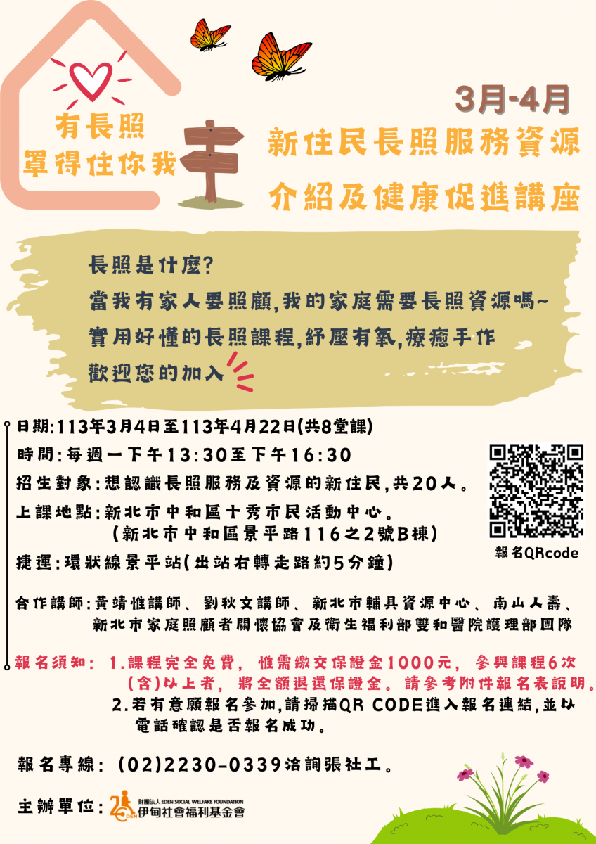 一、本會辦理「新住民長照服務資源介紹及健康促進講座」,訂於113年3月4日至4月22日,每週一下午1點半至4點半,假新北市中和區十秀市民活動中心(新北市中和區景平路116之2號B棟)進行辦理。
