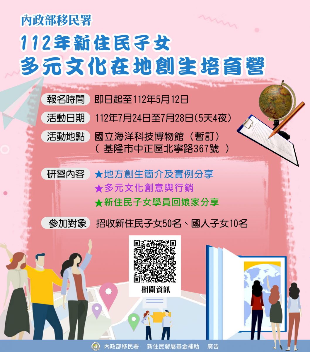 【轉知】內政部移民署-112年新住民子女多元文化在地創生培育營