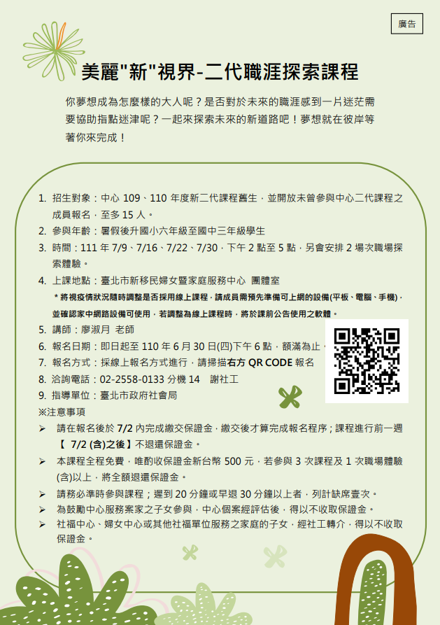 3.時間:111年7/9、7/16、7/22、7/30,下午2點至5點,另會安排2場次職場探索體驗。
