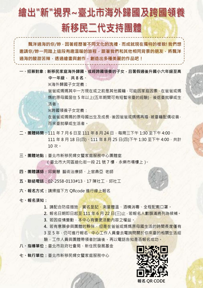【中心活動宣廣】新移民中心~繪出新世界~海外歸國或跨國領養新移民二代支持團體
