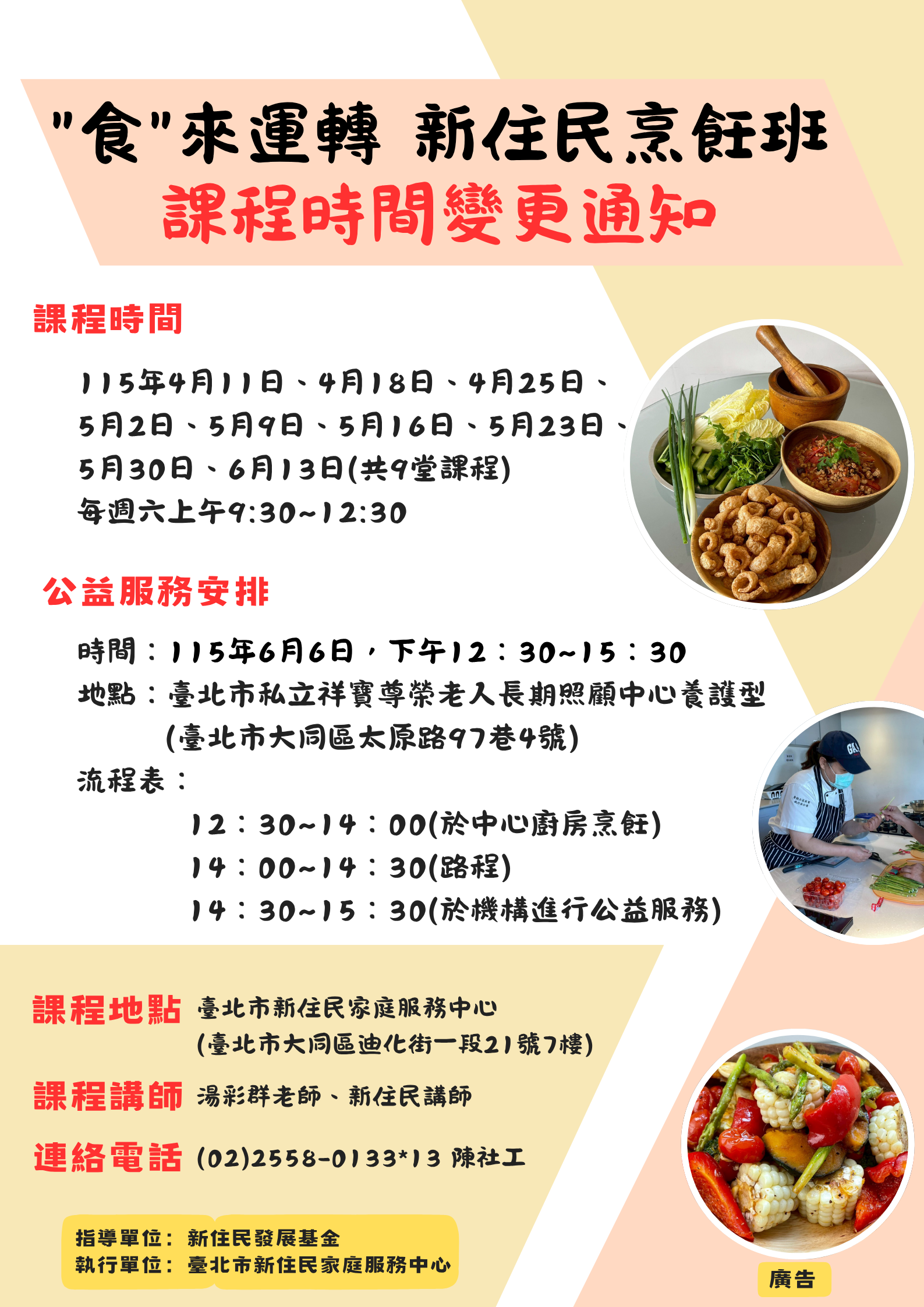 【中心活動公告】「食」來運轉-新住民烹飪班-公益服務時間調整通知