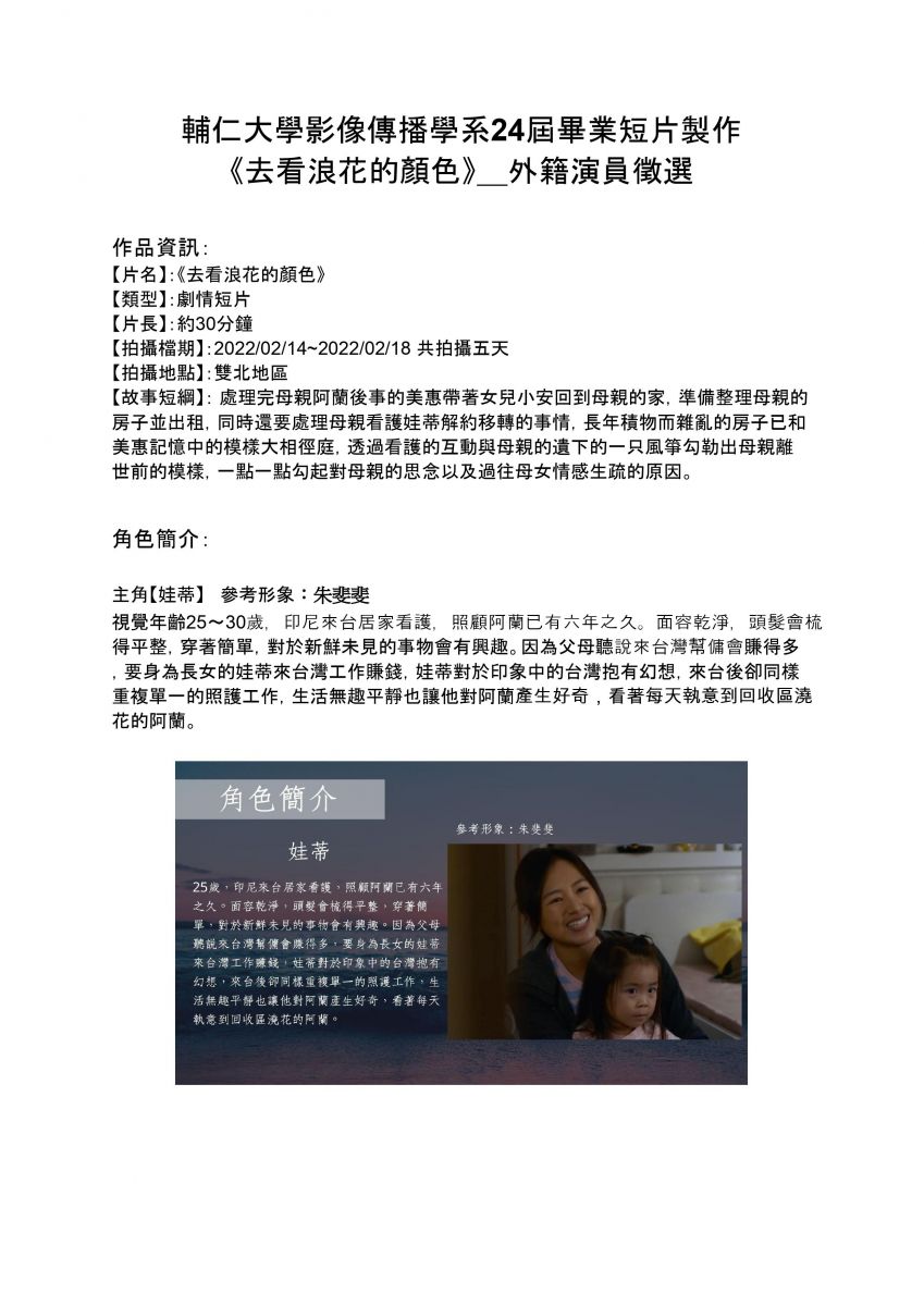 【轉知】輔仁大學影像傳播學系24屆畢業短片製作《去看浪花的顏色》-外籍演員徵選
