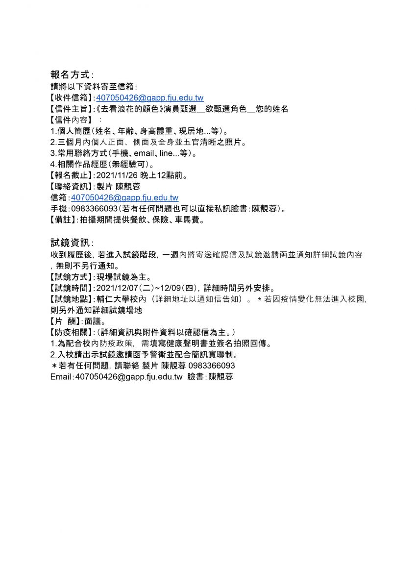 【信件主旨】:《去看浪花的顏色》演員甄選_欲甄選角色_您的姓名