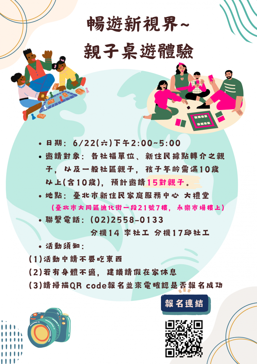 *招生對象:各社福單位、新住民據點之親子,以及一般社區親子,孩子年齡需滿10歲以上(含10歲),預計邀請15對親子