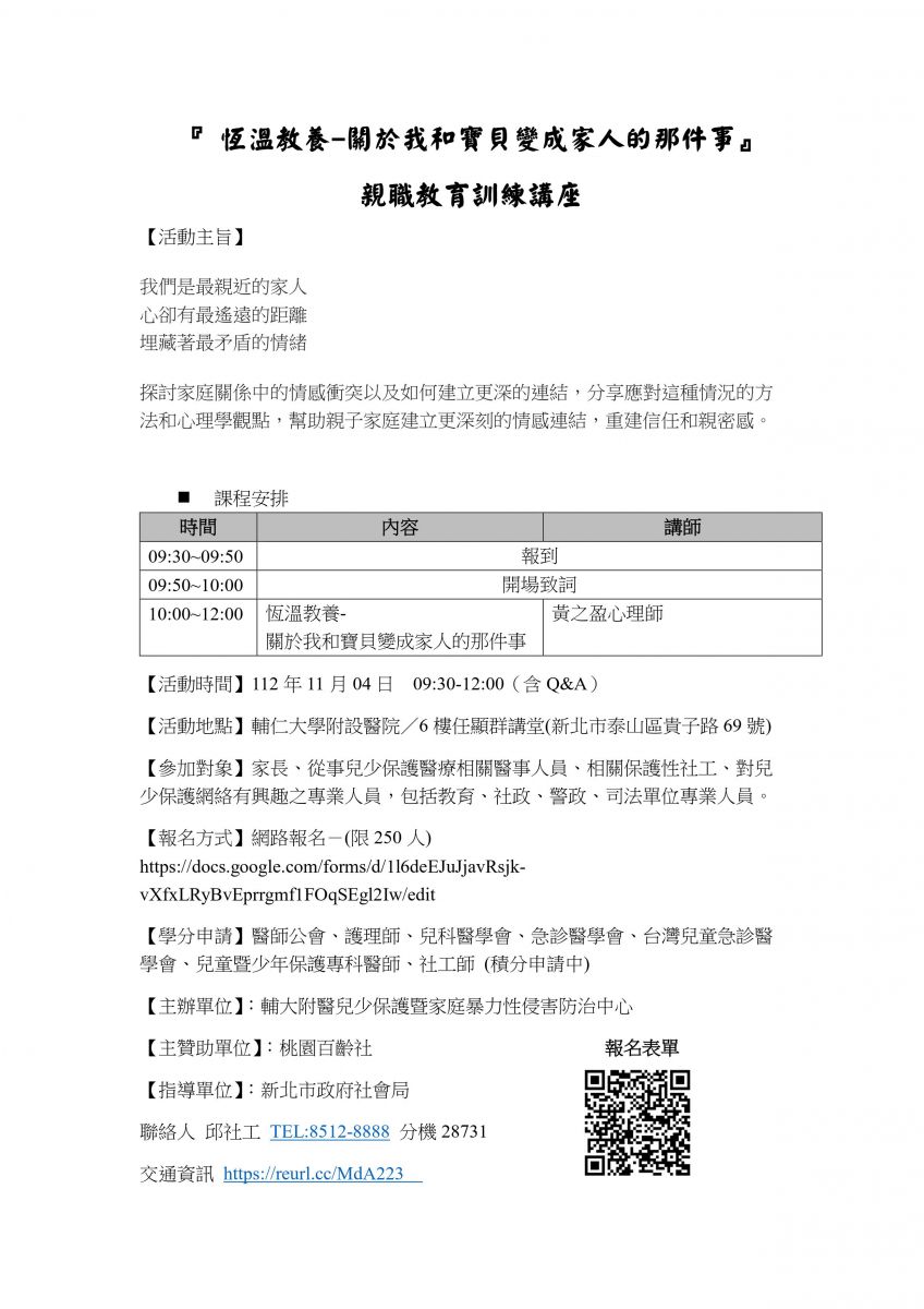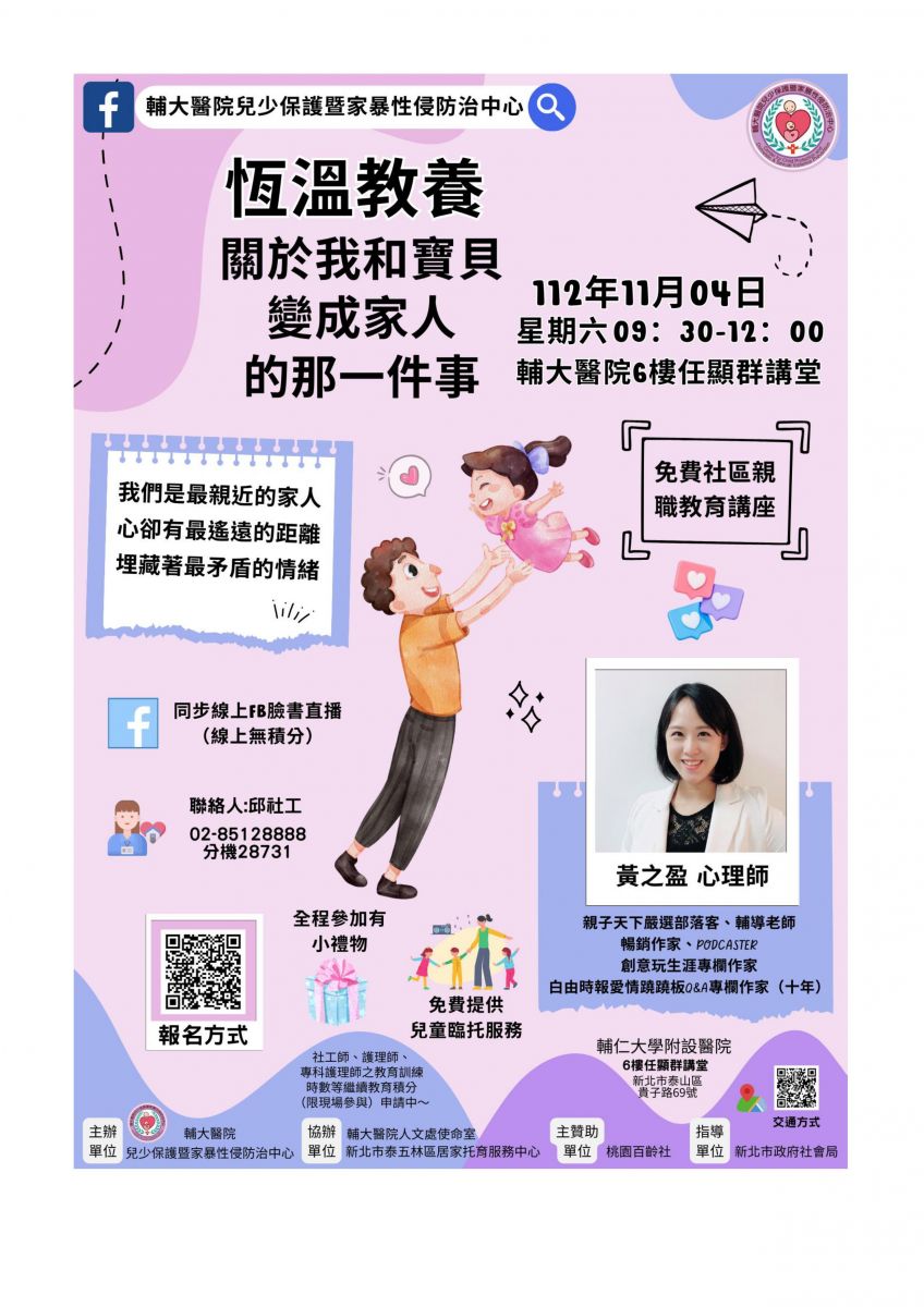 【轉知】輔大醫院兒少保護中心-11/04親職講座~恆溫教養-關於我和寶貝變成家人的那件事