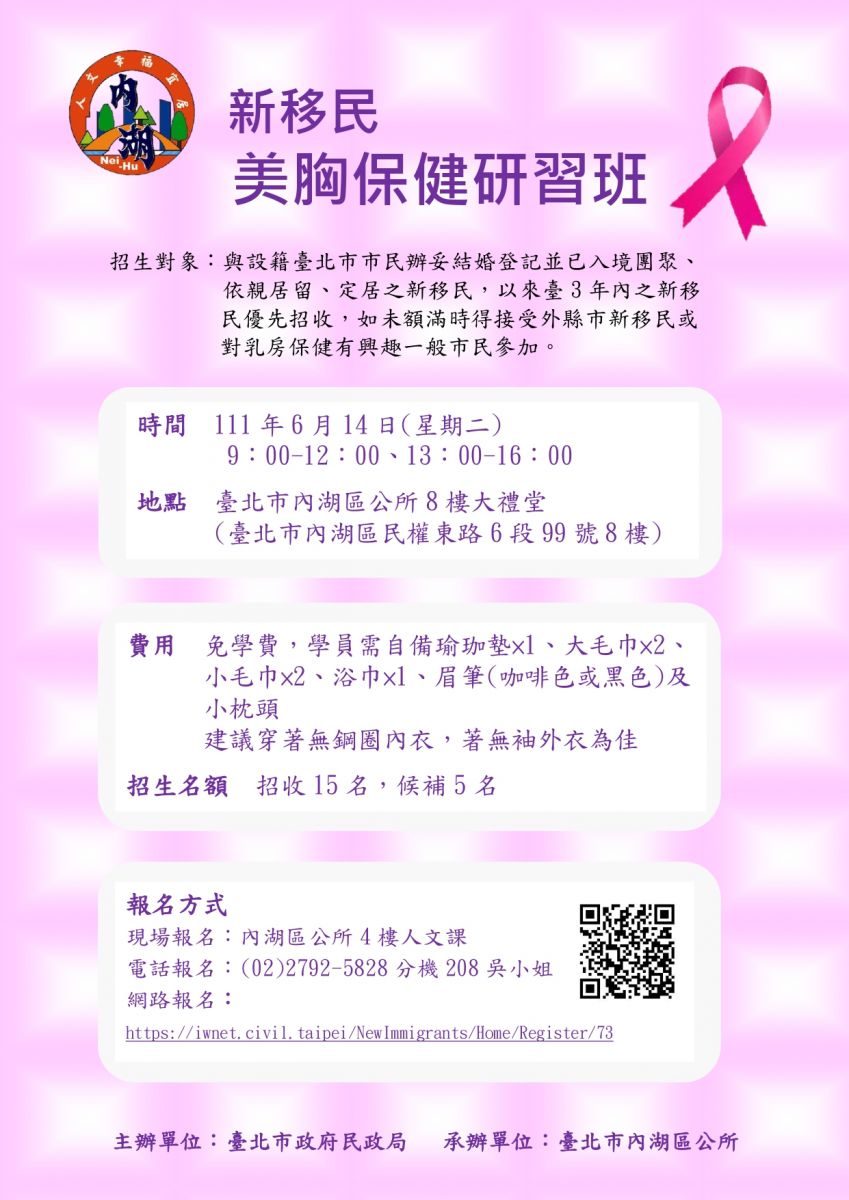 【轉知】內湖區公所-新移民美胸保健研習班