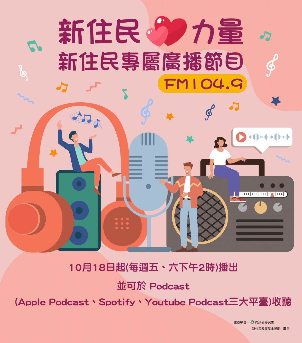 為保障新住民媒體近用權,本署委外製播旨揭廣播節目,將於113年10月18日起每周五及周六下午2時,於警廣FM104.9頻道播出,另可於Podcast三大平臺(Apple、Spotify及Youtube)下載收聽。